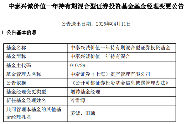 中国经济网北京4月11日讯 今日,中泰证券(上海)资产管理有限公司公告称,中泰兴诚价值一年持有混合(A类010728;C类010729)增聘基金经理冷雪源。