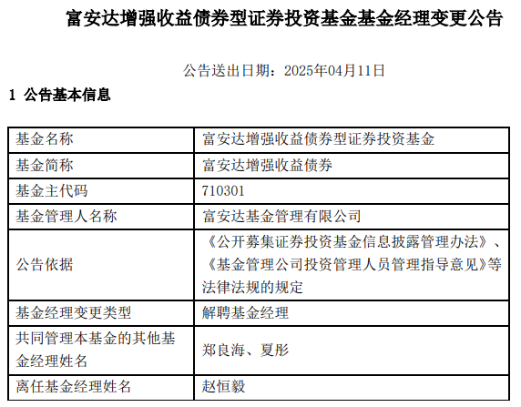 中国经济网北京4月11日讯 今日,富安达基金管理有限公司公告称,赵恒毅离任富安达增强收益债券(A类710301;C类710302)。