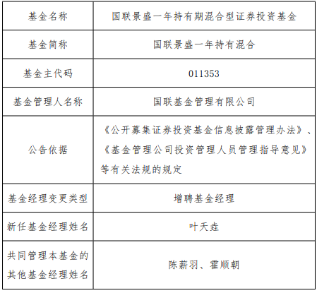 中国经济网北京4月11日讯 今日,国联基金公告,国联景盛一年持有混合增聘叶天垚。