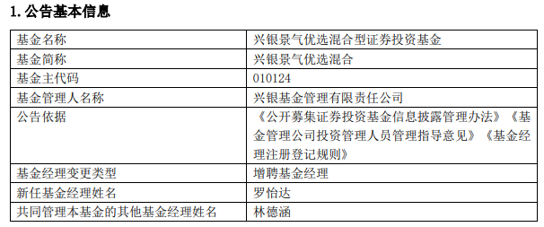 中国经济网北京4月11日讯 今日,兴银基金管理有限责任公司公告称,兴银景气优选混合(A类010124;C类010125)增聘基金经理罗怡达。