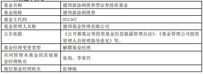 中国经济网北京4月15日讯 今日,德邦基金公告,张铮烁离任德邦新添利债券。