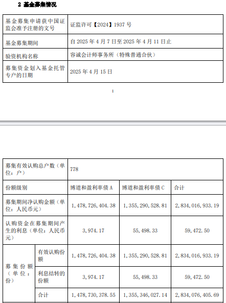 募集期间净认购金额2,834,016,933.19元,认购资金在募集期间产生的利息59,472.50元,募集份额合计2,834,076,405.69份。