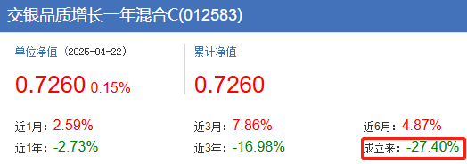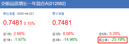 交银品质增长一年混合A/C成立于2021年7月23日,同样一直由韩威俊管理,但最新累计收益率亏损幅度却分别为25.19%和27.40%,累计净值仅为0.7481元、0.7260元。今年一季度的前十大重仓股与交银内需增长一年完全相同。