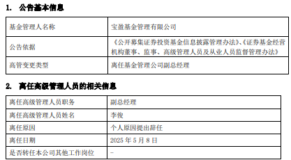 中国经济网北京5月12日讯 近日,宝盈基金公告,宝盈基金副总经理李俊离任。
