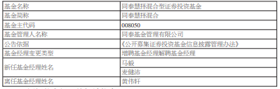 中国经济网北京5月13日讯 今日,同泰基金公告,同泰慧择混合、同泰大健康主题混合增聘马毅、麦健沛,黄伟轩离任。