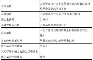中国经济网北京5月13日讯 今日,万家基金公告,万家中证软件服务ETF发起式联接增聘贺方舟,杨坤离任。