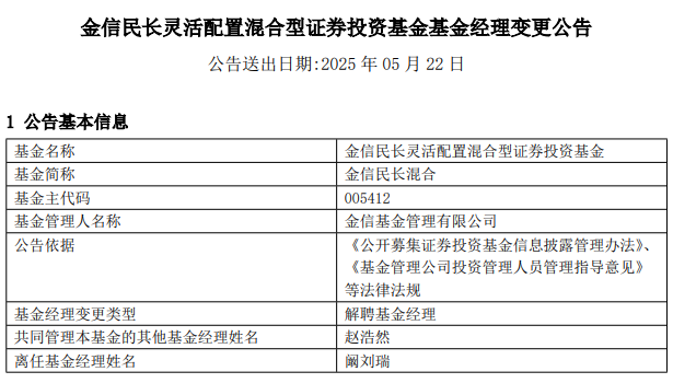 中国经济网北京5月22日讯 今日,金信基金管理有限公司公告称,阚刘瑞离任金信转型创新成长混合(A类002810;C类020384)、金信民长混合(A类005412;C类005413)。