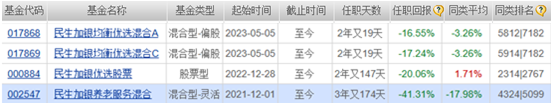 据悉,上述3只由蔡晓管理的基金均是其任职回报为负的基金。其中,民生加银养老服务混合从2021年12月1日接手,截至2025年5月22日,其任职回报为-41.31%。