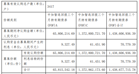 该基金募集期间净认购金额合计1,438,606,936.39元,认购资金在募集期间产生的利息合计70,779.39元,募集份额合计1,438,677,715.78份。