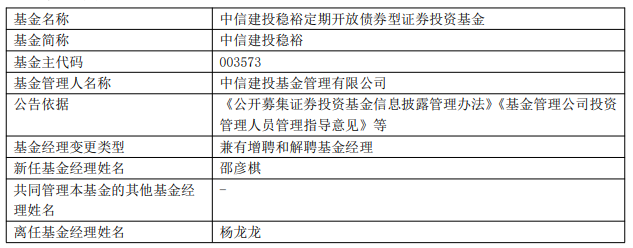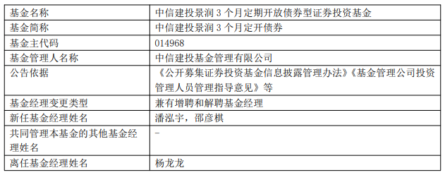 中信建投景晟债券、中信建投稳丰63个月定开债、中信建投稳裕增聘基金经理邵彦棋;中信建投景润3个月定开债券增聘基金经理潘泓宇、邵彦棋。