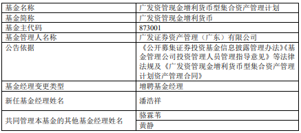 中国经济网北京7月7日讯 近日,广发证券资产管理(广东)有限公司公告,广发资管现金增利货币增聘潘浩祥。