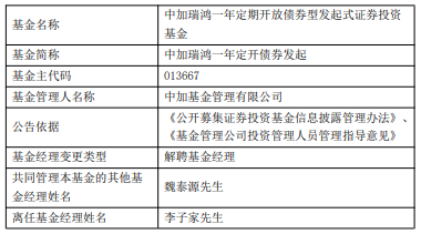 李子家离任中加瑞鸿一年定开债券发起 魏泰源管理