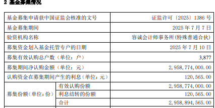 募集期间净认购金额2,958,774,000.00元,认购资金在募集期间产生的利息120,565.00元,募集份额合计2,958,894,565.00份。