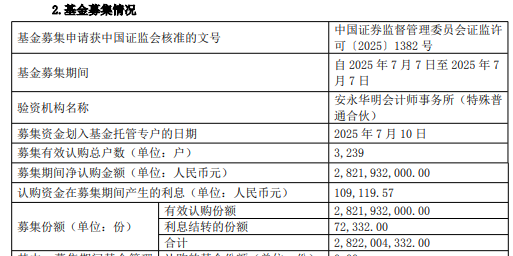 募集期间净认购金额2,821,932,000.00元,认购资金在募集期间产生的利息109,119.57元,募集份额合计2,822,004,332.00份。