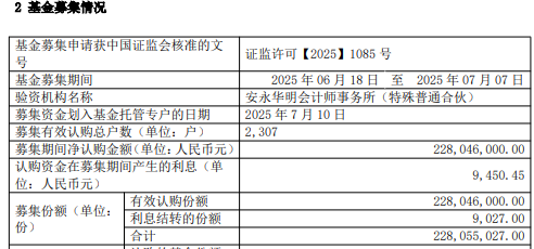 募集期间净认购金额228,046,000.00元,认购资金在募集期间产生的利息9,450.45元,募集份额合计228,055,027.00份。
