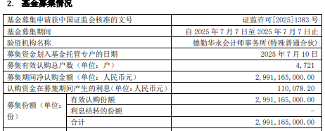 募集期间净认购金额2,991,165,000.00元,认购资金在募集期间产生的利息110,078.20元,募集份额合计2,991,165,000.00份。