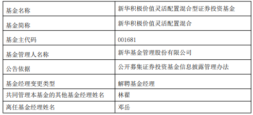 邓岳离任新华积极价值灵活配置混合 林翟管理