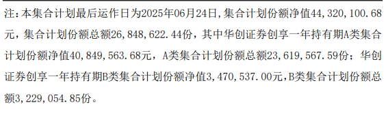 根据中国经济网记者了解,华创证券创享一年持有债券成立于2021年12月24日,A份额在当年底的规模为3.40亿元,B份额在2022年3月31日才披露规模为1.06亿元。而到最后运作日2025年6月24日,其份额净值为44,320,100.68元,集合计划份额总额26,848,622.44份。其中华创证券创享一年持有期A类集合计划份额净值40,849,563.68元,A类集合计划份额总额23,619,567.59份;华创证券创享一年持有期B类集合计划份额净值3,470,537.00元,B类集合计划份额总额3,229,054.85份。