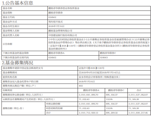 募集期间净认购金额3,011,537,052.07元,认购资金在募集期间产生的利息71,165.38元,募集份额合计3,011,608,217.45份。