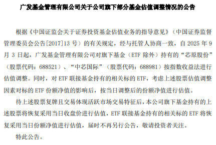 公告称,自2025年9月3日起,广发基金管理有限公司对旗下基金(ETF 除外)持有的“芯原股份”(股票代码:688521)、“中芯国际”(股票代码:688981)按指数收益法进行估值调整。同时,对ETF联接基金持有的相关标的ETF,考虑上述股票估值调整因素对标的ETF份额净值的影响后,按当日调整后的份额净值进行估值。