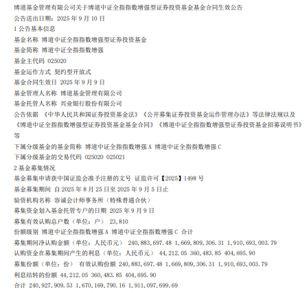 中国经济网北京9月10日讯 今日,博道基金管理有限公司发布关于博道中证全指指数增强型证券投资基金基金合同生效公告。