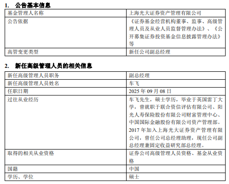 光大证券资管任命车飞为副总经理