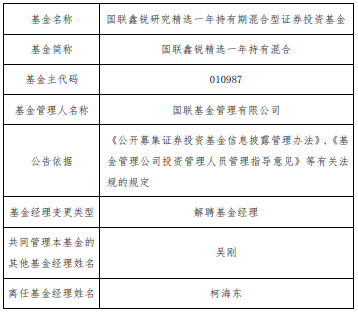 中国经济网北京9月10日讯 今日,国联基金公告,柯海东离任国联鑫锐精选一年持有混合、国联匠心优选混合。