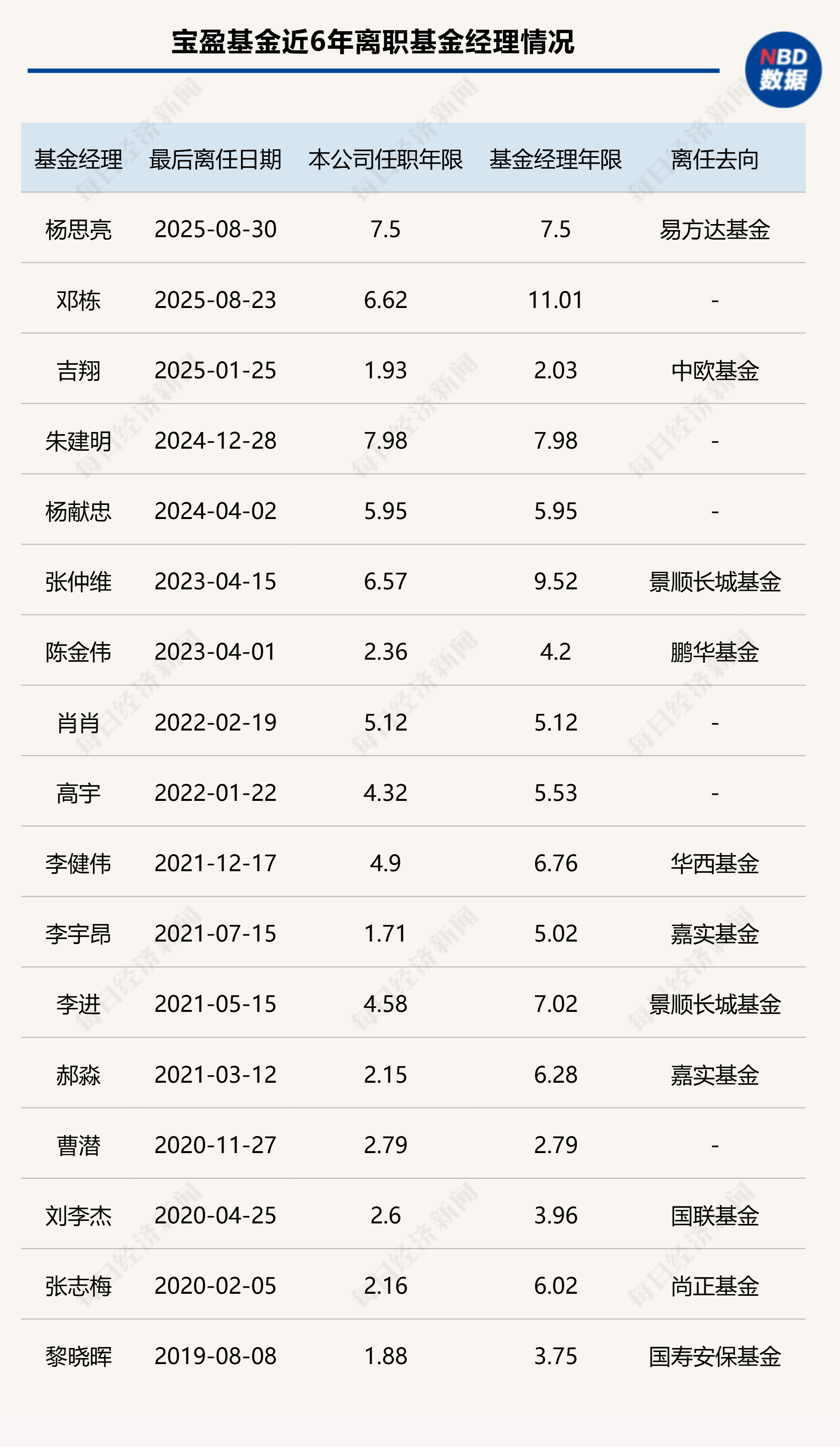 但光环的另一面是“留不住人才”。王茹远2014年公奔私,创立宏流投资;彭敢2016年跳槽东吴基金,后离开公募行业;张小仁、盖俊龙等人亦在2017年前后相继出走。杨思亮历经研究员、基金经理助理,一步步走到百亿名将的位置,如今也转身离去。对宝盈基金来说,“培养-流失”的循环似乎已经司空见惯。