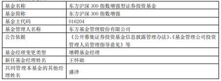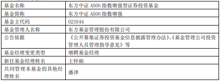 中国经济网北京9月16日讯 今日,东方基金公告,东方中证A500指数增强、东方沪深300指数增强增聘王怀勋。