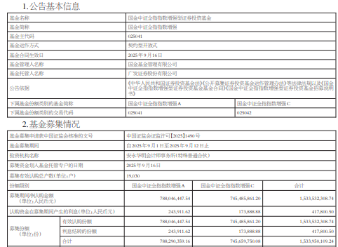 募集期间净认购金额1,533,532,308.74元,认购资金在募集期间产生的利息417,800.50元,募集份额合计1,533,950,109.24份。