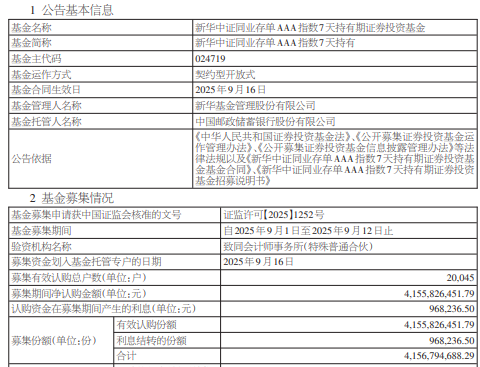 新华中证同业存单AAA指数7天持有成立 规模41.6亿元