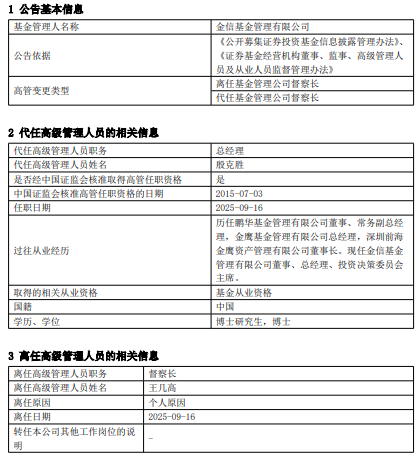 中国经济网北京9月17日讯 今日,金信基金公告,督察长王几高离任,总经理殷克胜代任。