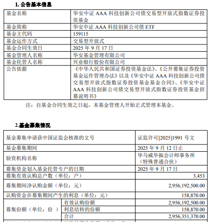 华安中证AAA科技创新公司债ETF成立 规模29.6亿元