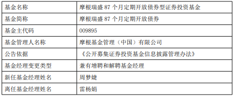 中国经济网北京9月19日讯 今日,摩根基金公告,雷杨娟离任摩根瑞锦纯债债券、摩根瑞盛87个月定期开放债券、摩根纯债丰利债券、摩根丰瑞债券。