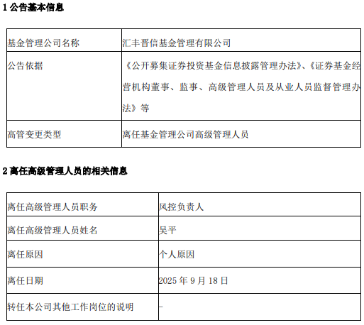 汇丰晋信基金风控负责人吴平离任