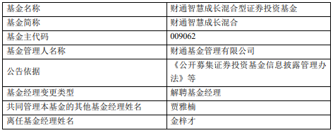 金梓才离任财通智慧成长混合 贾雅楠管理