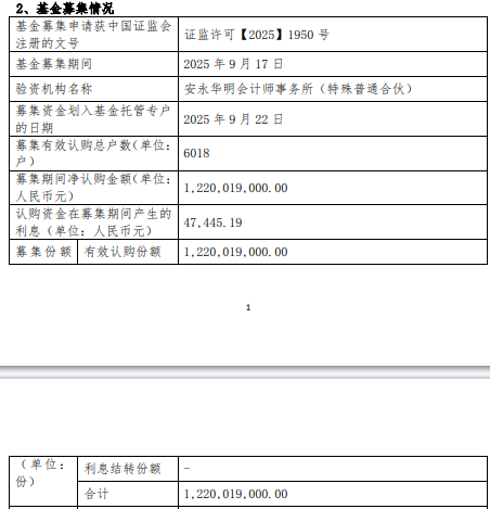 募集期间净认购金额1,220,019,000.00元,认购资金在募集期间产生的利息47,445.19元,募集份额合计1,220,019,000.00份。