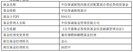 中国经济网北京9月23日讯 今日,中信保诚基金公告,中信保诚新泽混合、中信保诚新悦混合增聘金山,孙浩中离任。