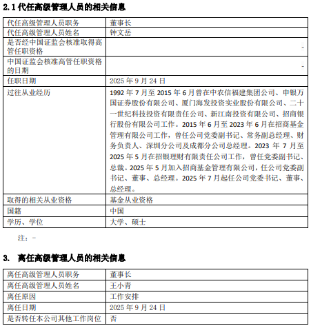 招商基金董事长王小青因工作安排离任 钟文岳代任