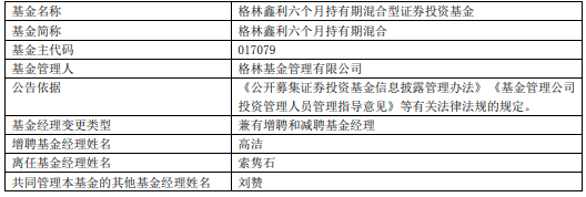 索隽石离任格林鑫利六个月混合格林泓泰三个月定开债