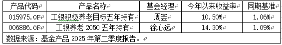 3、工银积极养老目标五年持有成立于2022年12月20日,基金经理周崟自产品成立以来管理该产品。该产品今年以来、过去一年及2023、2024年度净值增长率分别为:10.50%、17.74%、-13.37%、4.25%;同期业绩比较基准为:1.06%、13.07%、-6.66%、11.56%。数据来源:基金产品2025年二季报及各年度年报。