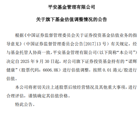 公告称,平安基金管理有限公司(以下简称“本公司”)决定自2025年9月30日起,对公司旗下证券投资基金持有的“诺辉健康”(股票代码:6606.HK)进行估值调整,按照0.01港元/股进行估值。公司将密切关注上述股票后续经营情况及其他重大事项,进行合理评估,谨慎确定其估值价格。