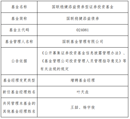 中国经济网北京10月20日讯 近日,国联基金公告,国联稳健添益债券增聘叶天垚。
