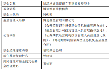中国经济网北京10月20日讯 近日,博远基金公告,博远增睿纯债债券增聘钟鸣远。