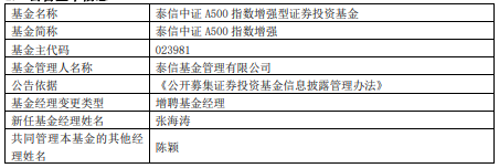 中国经济网北京10月21日讯 今日,泰信基金公告,泰信中证A500指数增强增聘张海涛。
