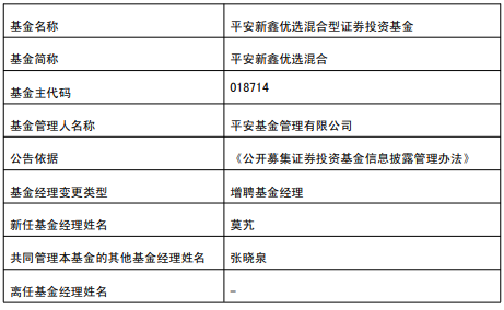 中国经济网北京10月21日讯 今日,平安基金公告,平安新鑫优选混合增聘莫艽。