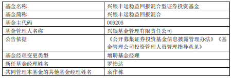 兴银基金旗下4只基金增聘罗怡达