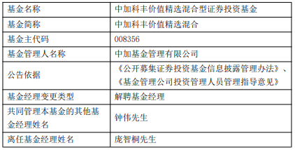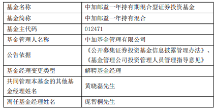 中国经济网北京10月24日讯 昨日,中加基金公告,庞智桐离任中加科丰价值精选混合、中加心享混合、中加邮益一年持有混合。