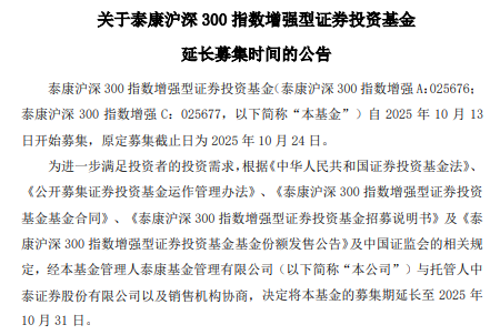 公告称,泰康沪深300指数增强型证券投资基金(泰康沪深300指数增强 A:025676;泰康沪深300指数增强 C:025677,)自2025年10月13日开始募集,原定募集截止日为2025年10月24日,现决定将该基金的募集期延长至2025年10月31日。