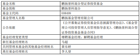 中国经济网北京10月27日讯 近日,鹏扬基金公告,鹏扬景科混合增聘马超,李人望离任。